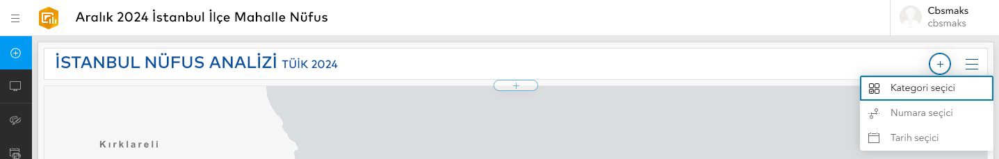 Ekranın sol üst tarafında + işareti ile ‘Öge Ekle’ seçeneği bulunmaktadır. Bu seçenekle; harita, harita lejantı, seri çizge ve pasta grafikleri, rakamsal göstergeler, listeler, tablolar ve gömülü içerikler eklenebilir. Diğer grafiklerin oluşturulabilmesi ve istatistik verilerini kullanabilmek adına önce harita ögesi eklenir. Ardından kategori seçici ekleyebilmek için önce başlık eklenir. (Görüntü 7.)