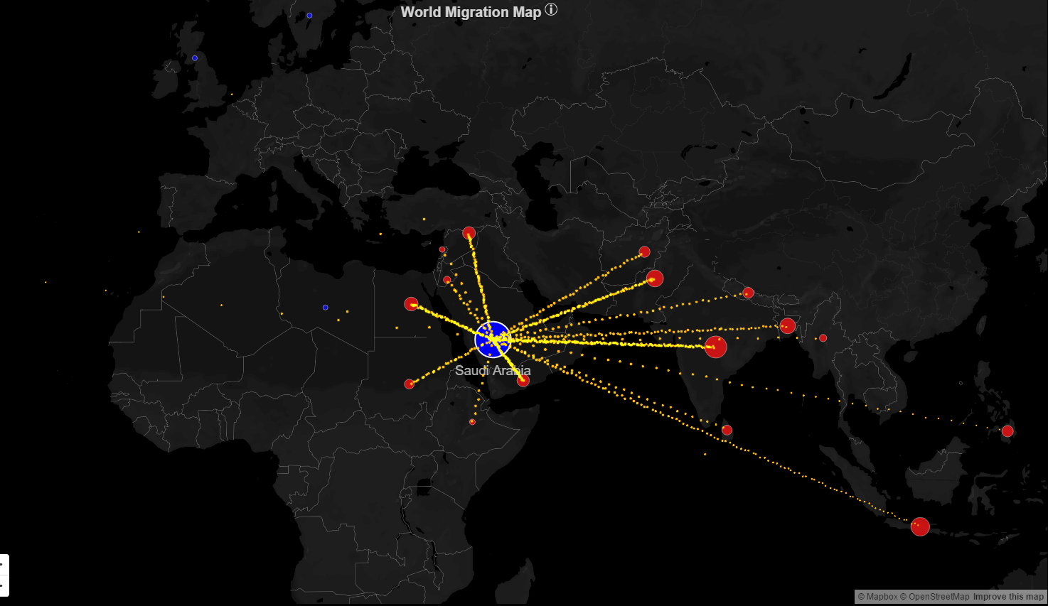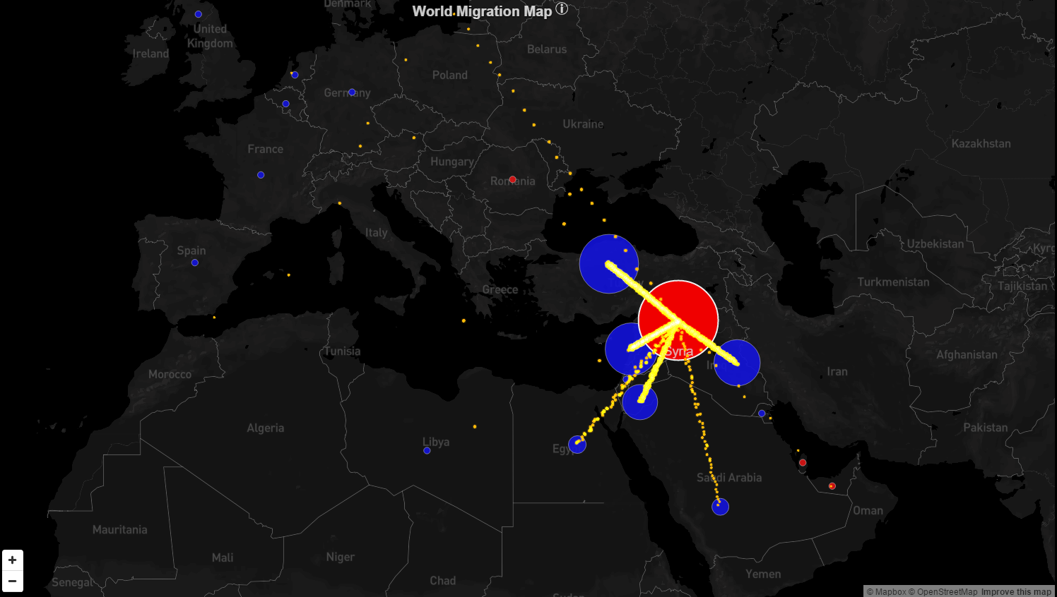 Bu interaktif harita sayesinde herhangi bir ülkenin hangi ülkelerden ne kadar göç aldığı ve hangi ülkelere ne kadar göç verdiği kolayca görülebilir. Haritayı yakından incelediğimizde en çok göç veren ülkeler 4.5 milyon ile Suriye ve yaklaşık 2.5 milyon ile Hindistan olmuş.