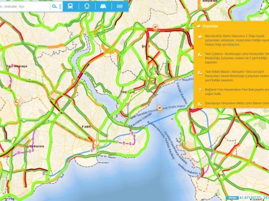 Trafik Müdürlüğü'nün hazırladığı Trafik Yoğunluk Haritası ve İstanbul trafiği ile ilgili duyurular Şehir Haritası üzerinde gösteriliyor.