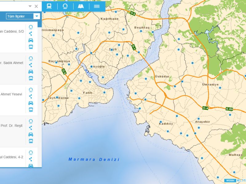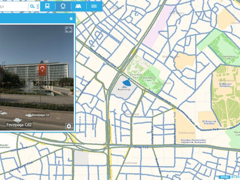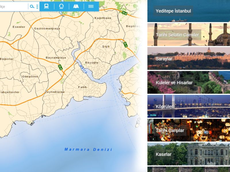 360 derece panoramik sokak görüntülerinin yer aldığı Şehir Haritası, akıllı adres arama, bilgi servisleri, yol tarifi, yakınımda ara, bilgi alma, geçmiş yılların haritalarını gösterim, hata bildirimi, öneri iletimi, ölçme ve konum gösterme, yazdırma paneli, yardım menüsü gibi modüller içeriyor.