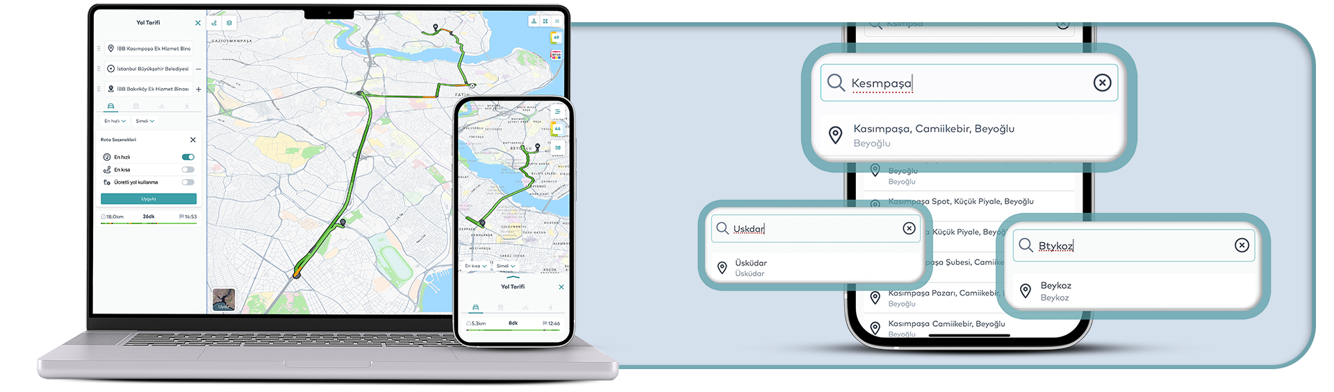 Yapay Zekâ Teknolojisi kullanılarak geliştirilen arama motoru ile artık aradığınız yeri bulmak daha hızlı ve daha kolay. Karmaşık adreslerin ve sorguların anlaşılması ve işlenmesini, kullanıcıların aradıkları konumları kolay ve hızlı bir şekilde bulmalarını sağlamaktadır. Yeni rotalama özelliği ile birden çok nokta için rota oluşturabilir ve yakınımda ara fonksiyonu ile 500 m-10 km arasında filtreleme yaparak detaylı arama yapabilirsiniz.